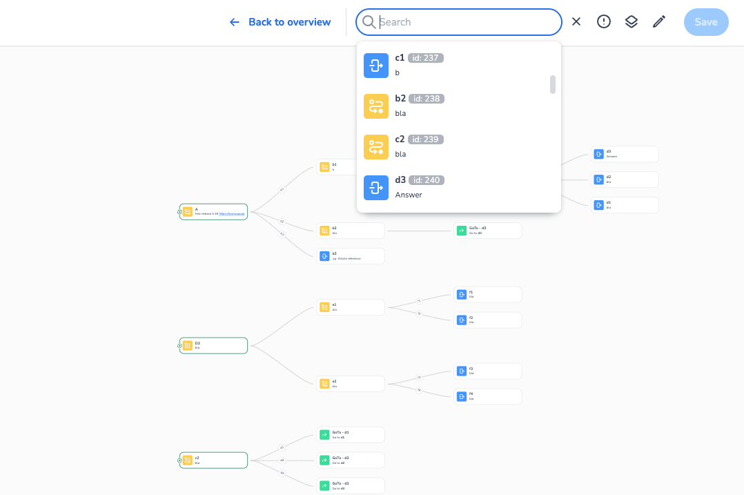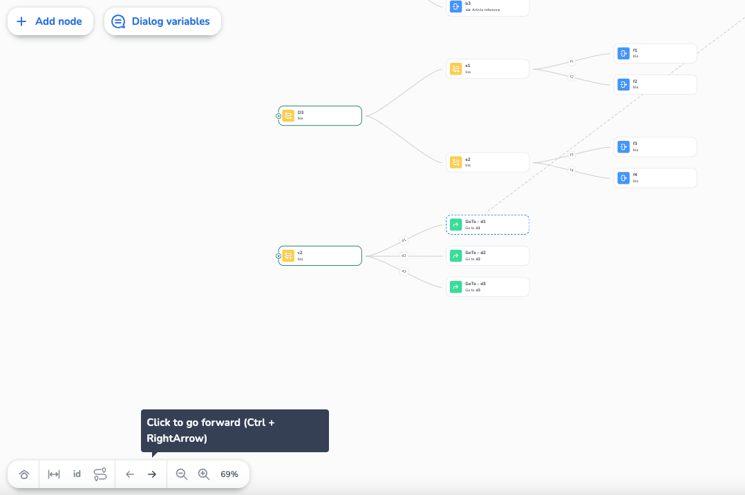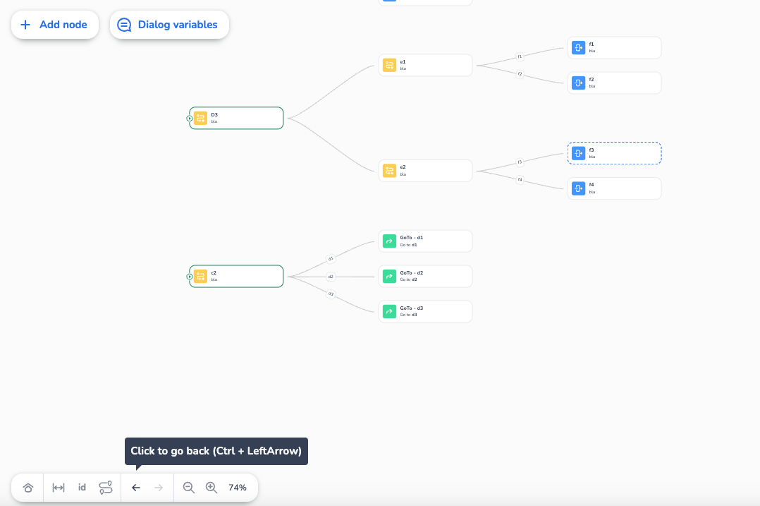 Within the toolbar we added a 'back' and 'forward' button to step back or go forward in your clicking history within the dialog. An easy way and quick way to step back when you've clicked on 'view target' within a go-to node.