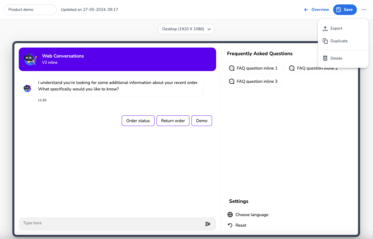 Based on customer feedback we've improved the UX of the Web Conversations builder. In order to export, duplicate or delete your configuration you'll have to click on the 'three dots' next to the blue save button.