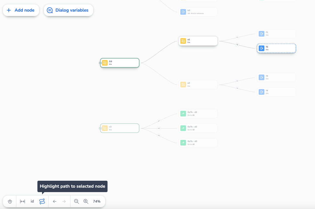 Each dialog node can now be individually positioned by holding down the SHIFT-key on your keyboard, clicking and holding a node, and then moving it to the desired position on your dialog canvas. You can reset all nodes to their original positions by clicking the reset button in the toolbar. To reset individual nodes, click the three dots at the top of the node and select "Auto Position."