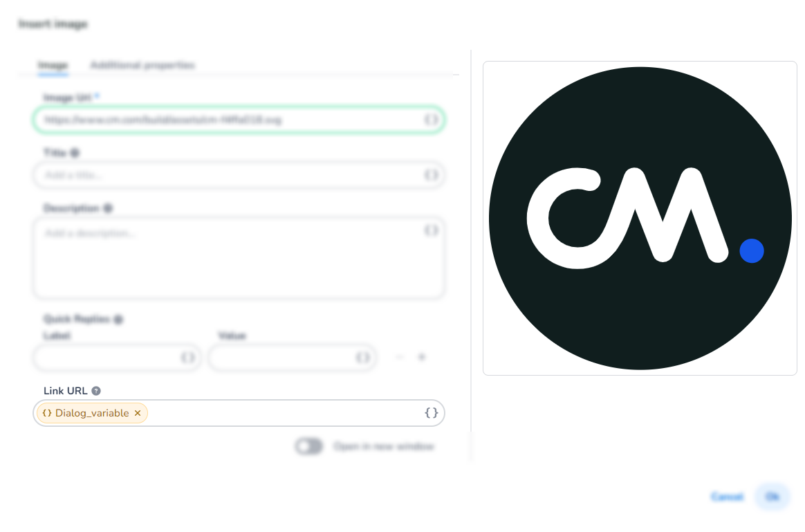 With the this release we're introducing the capability to add a dialog variable to an image link URL. This enables you to save a URL within a variable throughout the users dialog journey and utilize it to create a clickable image:
