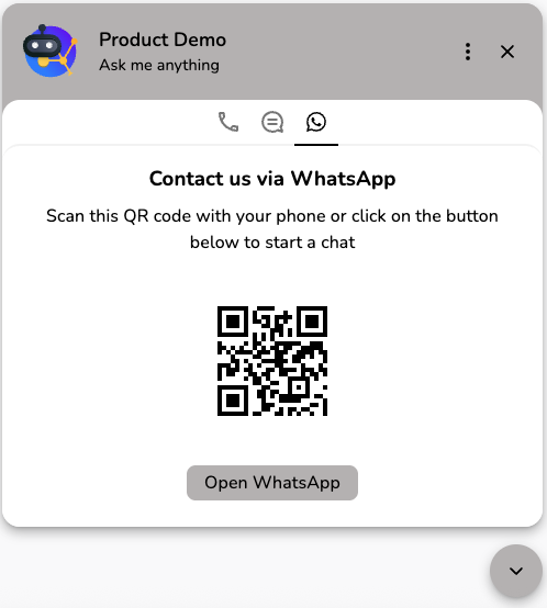 You can now add WhatsApp and Phone as a channel button directly to your Web Conversations widget, making it easier for end user to start a conversation via their preferred channel. Clicking on the "Open WhatsApp" button will redirect you to WhatsApp web or open WhatsApp on your mobile phone. Same for the phone option. Clicking on "Call +.." will give the initiate a call on your phone or OS.