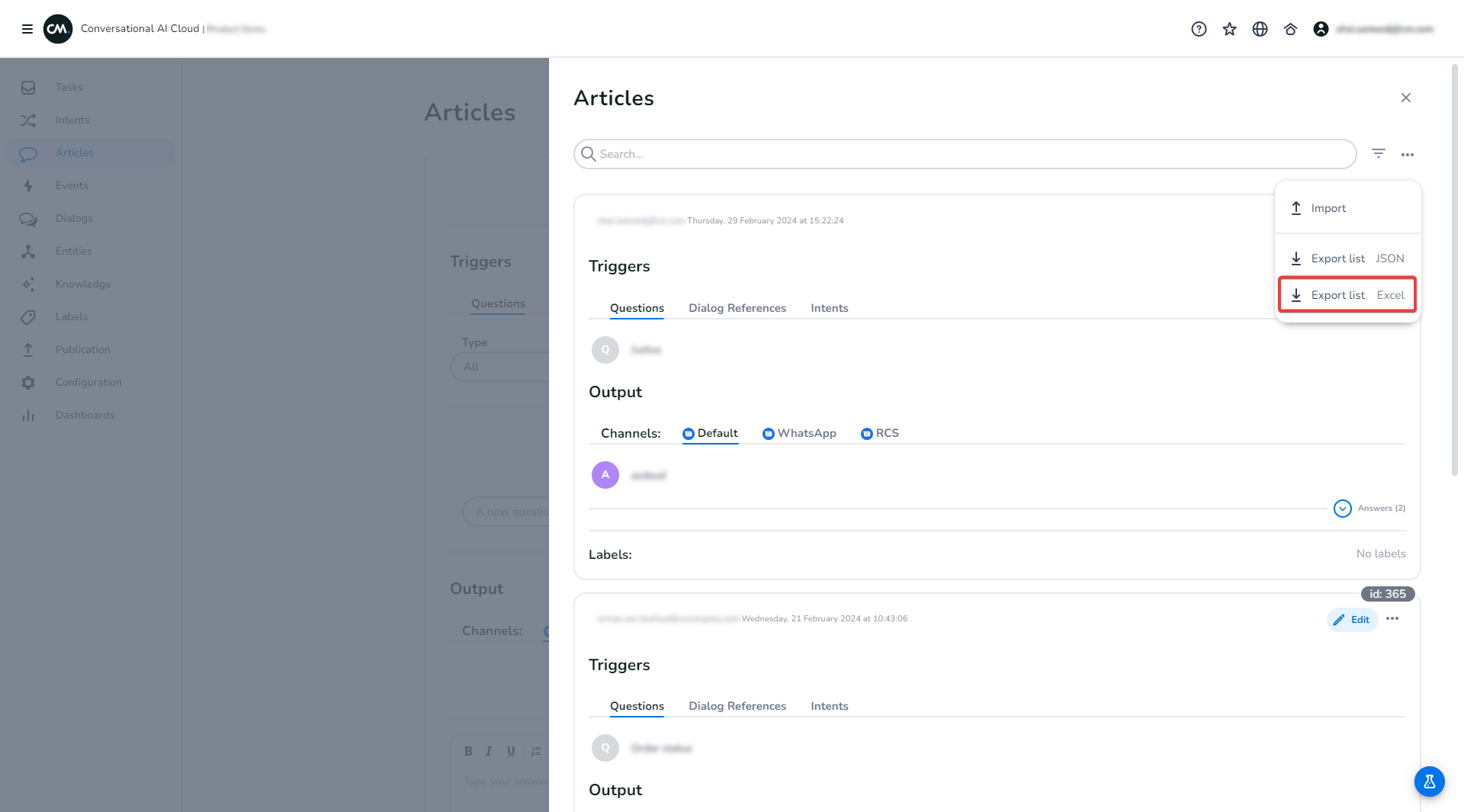 As mentioned in the previous release you are able to export articles in .xlsx format. Now with this release extended to export dialogs and events in .xlsx format.