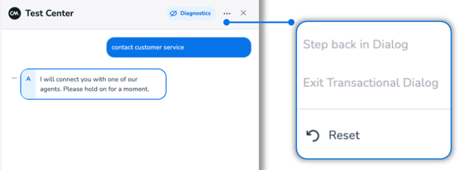 Menu Options: The three-dot menu will be implemented next to the 'Diagnostics' button. This menu offers options to navigate back in dialogs, exit Transactional Dialogs, or reset conversations.