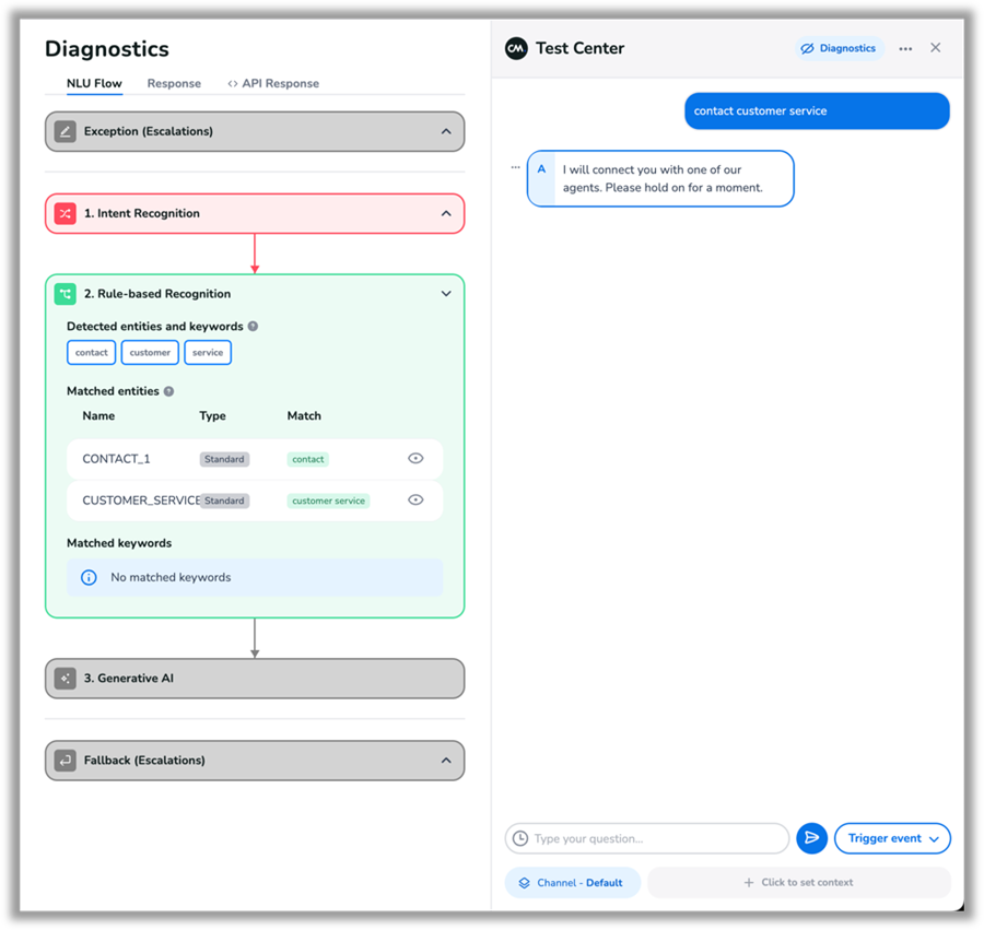 Exceptions: These are events triggered in Conversational AI Cloud before a (test) question is fully processed. For example, if a customer query contains more than 150 characters, a 'character limit' event can be triggered, indicating that the customer query exceeds the character limit.