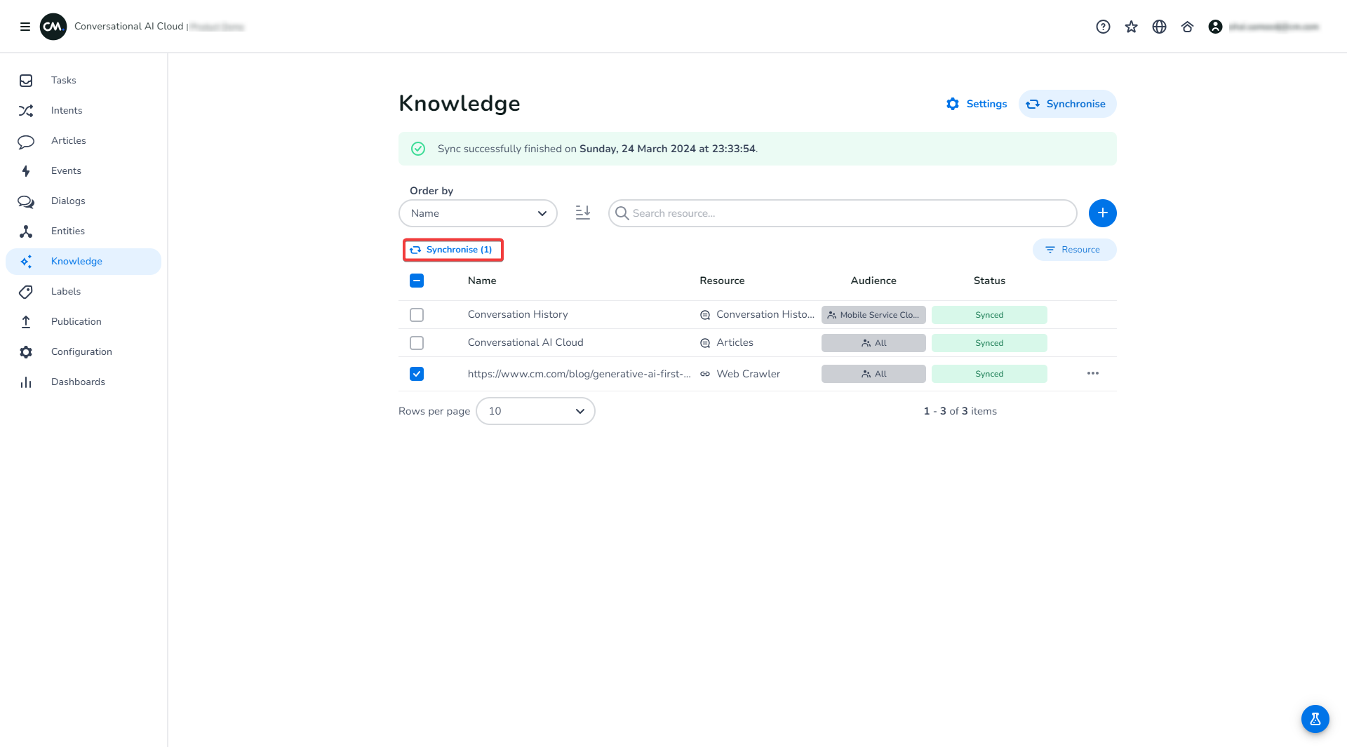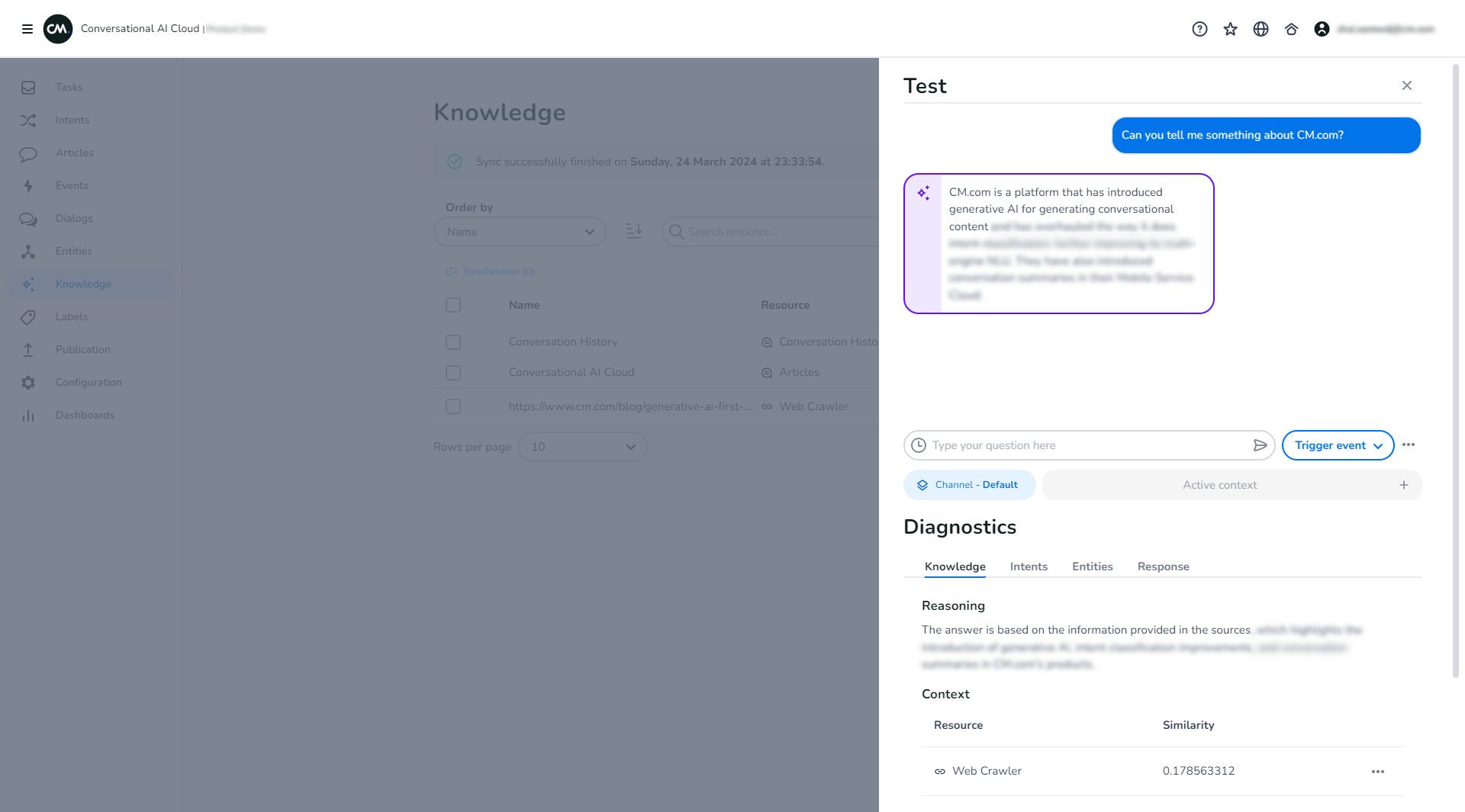 Improvements to the knowledge center, you are now able to view the resources were utilized in generating an answer within the test center, synchronise individual resources, define a blacklist for the web crawler, and schedule daily/weekly synchronizations of your resources. We've also increased the amount of characters you can use while defining the tone of voice.