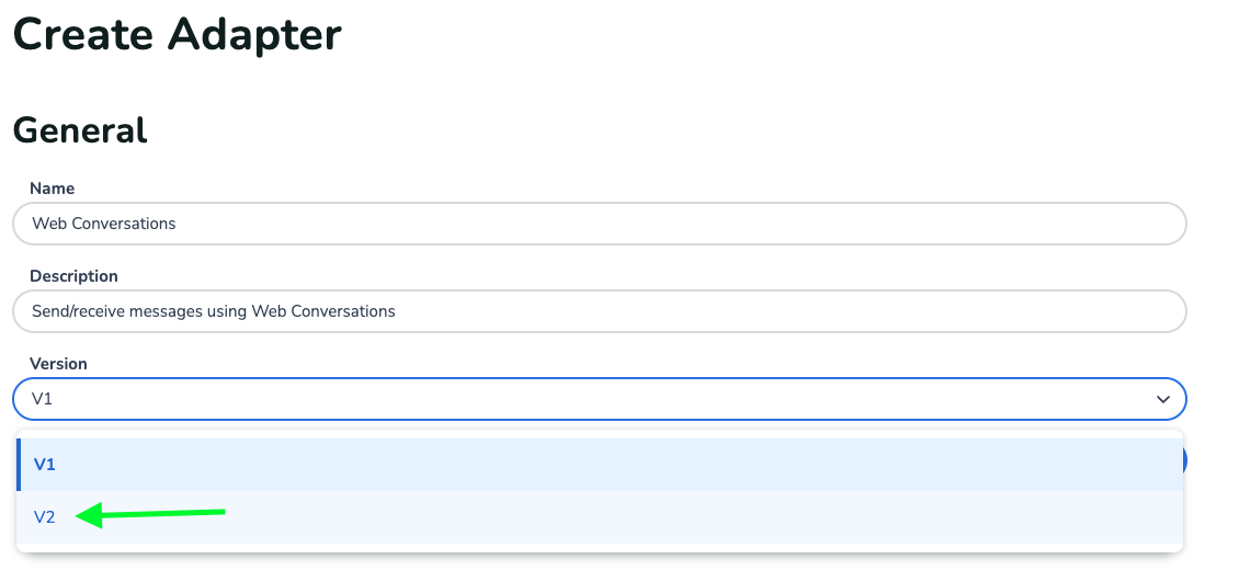 Previously when using the V2 endpoints of Web Conversations and Conversational AI Cloud the link-up between the two of them was done via a custom TwoWay adapter. We have now added a dropdown to their respective adapter configuration pages to enable linking between both V1 and V2 versions. This decreases changes of mistakes and increases configuration velocity.