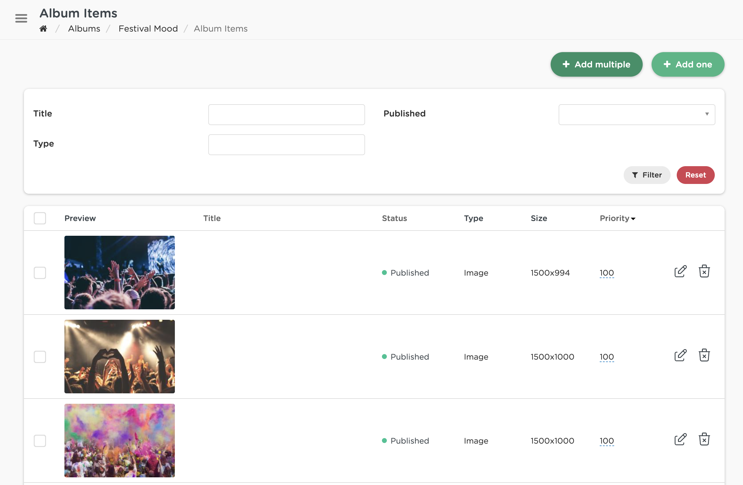Previously when adding images to an album those had to be created and uploaded one by one, making this a painstakingly tedious task. Not anymore. From now on you can choose to either Add one or Add multiple items. When selecting Add multiple you can upload up to 50 images at once.