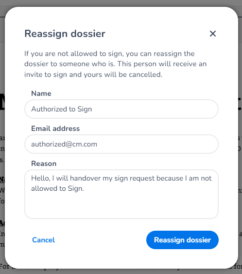 Exciting news for all our users! We're thrilled to announce the rollout of a highly requested feature: the ability to request reassignment for sign requests. Now, as a signee, you have more flexibility than ever before. In addition to the familiar actions of signing or declining a sign request, you can also request a reassignment. This feature is particularly useful when you're invited to sign an agreement but lack the authority to do so.