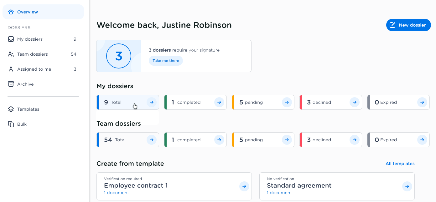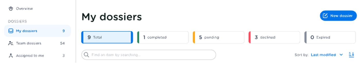 We've introduced a brand-new overview (Beta) aimed at providing a better view of all dossiers in their different states. Dossiers requiring your attention will be highlighted at the top of the dashboard. Additionally, templates are now more prominent when creating a new dossier, making the process more efficient and effective.