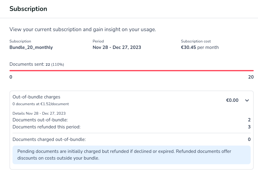 - Potential out-of-bundle charges. Documents that have been declined or expired will be deducted from the out-of-bundle documents in the given period. Thanks to this real-time overview, you can closely monitor your consumption.