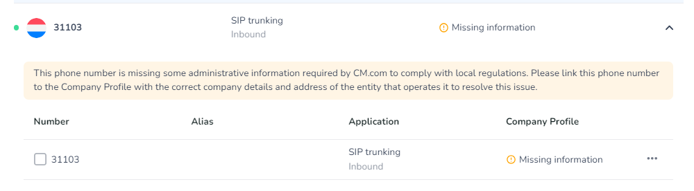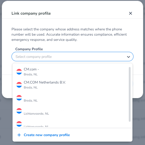 It is mandatory by Telecom regulations to have your business name, address, postal code and location registered for every phone number purchased at CM.com. As such, it is mandatory to create a Company Profile which includes your business name, address, postcode and city. Once created and approved, you must assign your phone number to this Company Profile to finalize the process.
