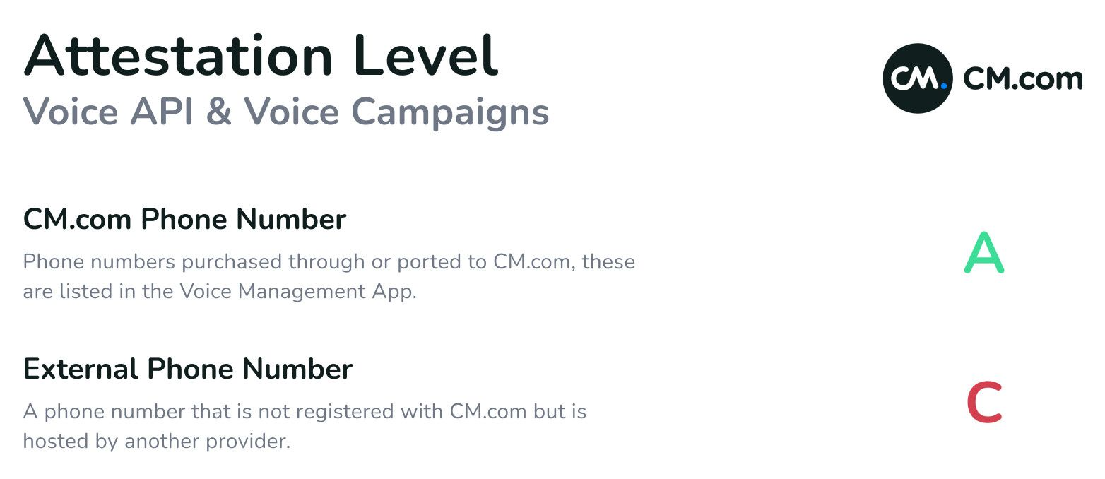 For the Voice API and Voice Campaigns, you can only receive an attestation A-level when you initiate the calls with numbers you own in the CM.com Voice platform. All calls created with other phone numbers will be downgraded to C-level.