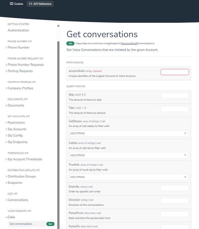 You can find the documentation on developers.cm.com under Voice, API Reference, and then Voice Insights API. You can also use the direct link: Get conversations (cm.com)
